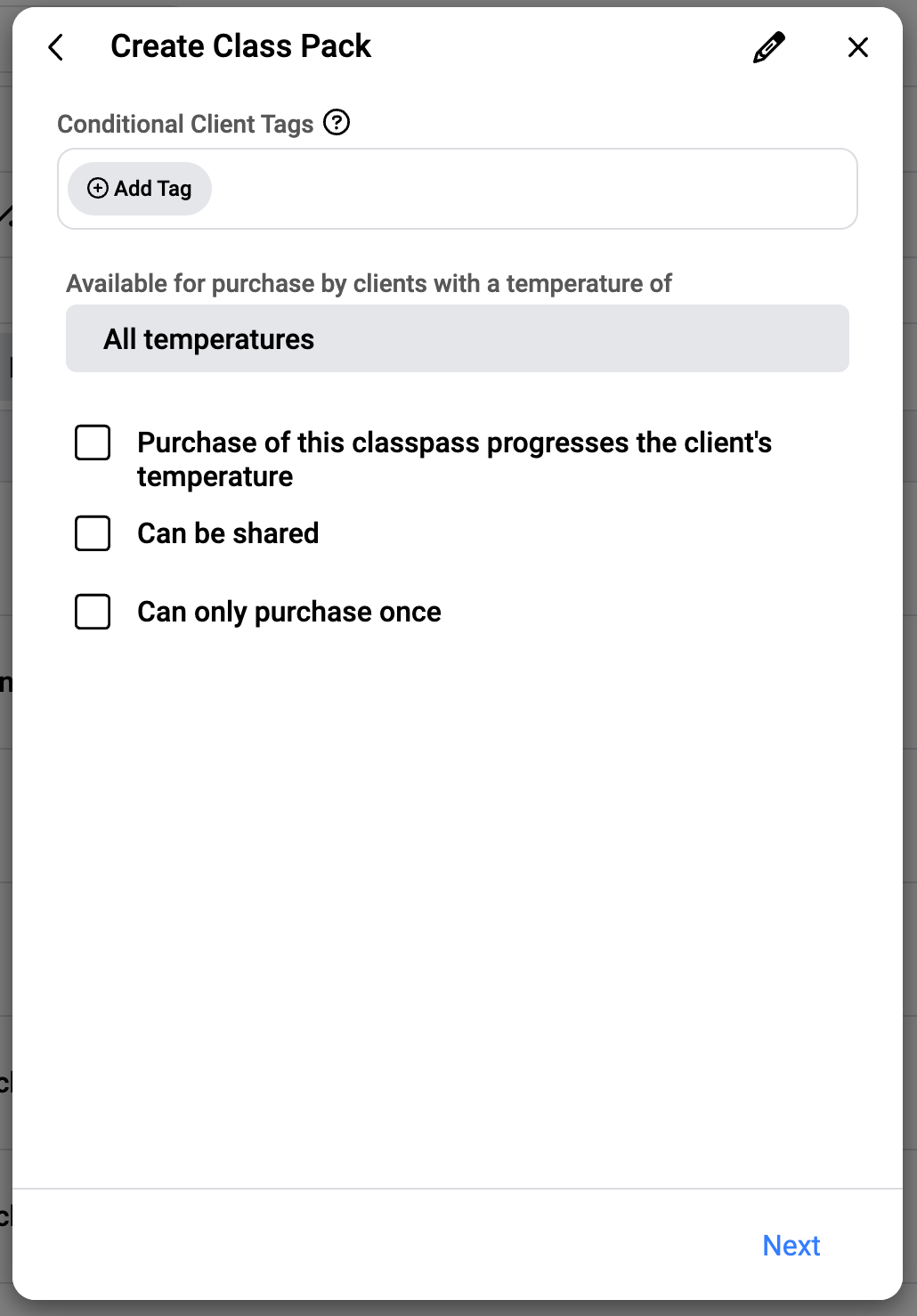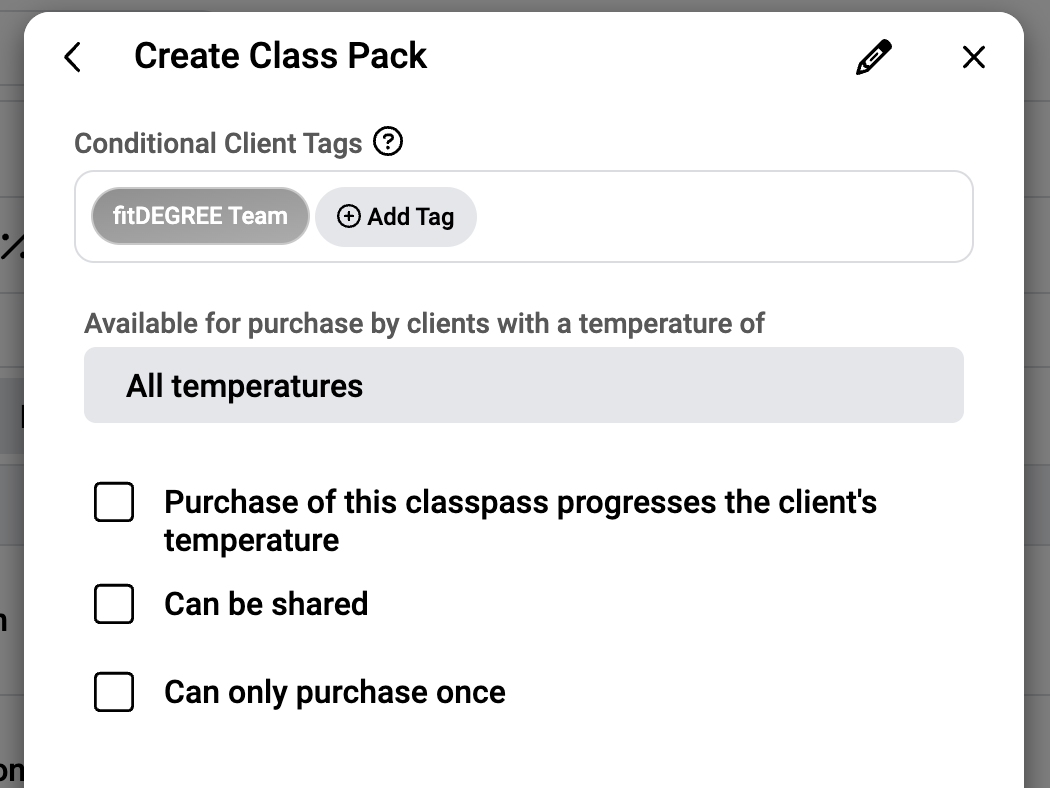 At the top of the second section is the ability to add a Conditional Client Tag. If you wish for your Class Pack to be linked to a Client Tag so that when they purchase it, the Tag is added, then add that Client Tag that you wish to be linked here.