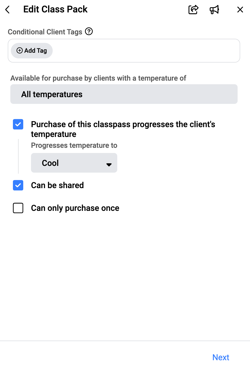 Reminder - all Conditional Tags are applied and removed based on the Class Pack being Active in a Client's account. Once the Class Pack is expired or runs out of uses, then it will become Inactive and the Conditional Tag will no longer appear on their account until the next time this same type of Pricing Option is Active in their account.